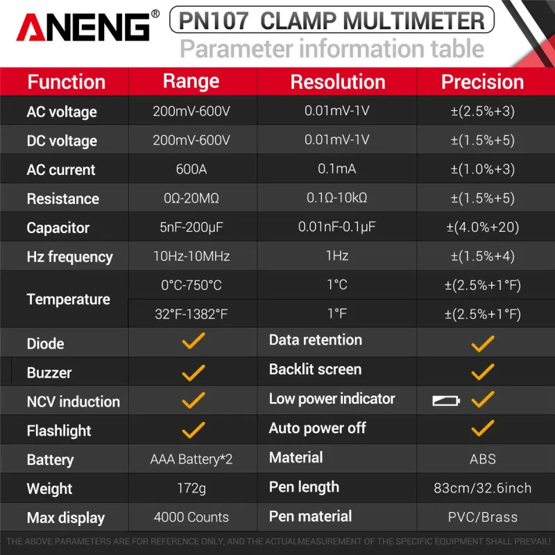 Upgrade ANENG PN107 Multifunctional Clamp Meter with AC/DC Voltage AC Current Resistance Capacitor Hz Frequency Temperature Measurement Features Precision Readings Backlit Screen Flashlight