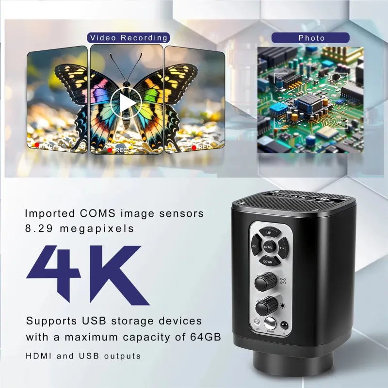 XHU6001 4K Digital Microscope for HDMI Camera 160X Sony IMX415 Sensor Magnification USB Output High Brightness Adjustable Light Source Long Working Distance Plug and Play Photography Video Recording