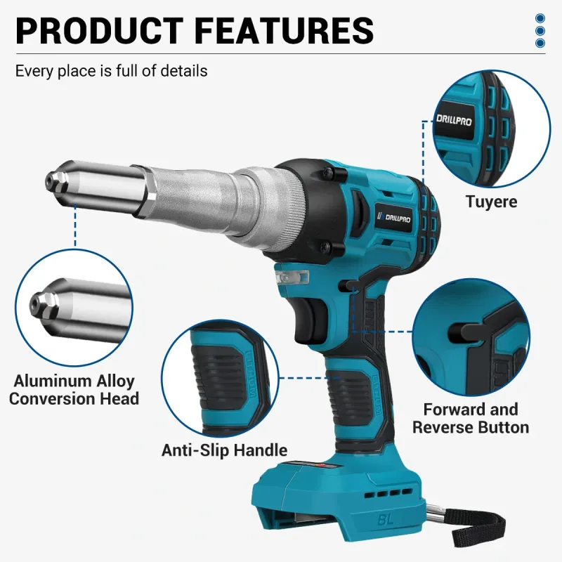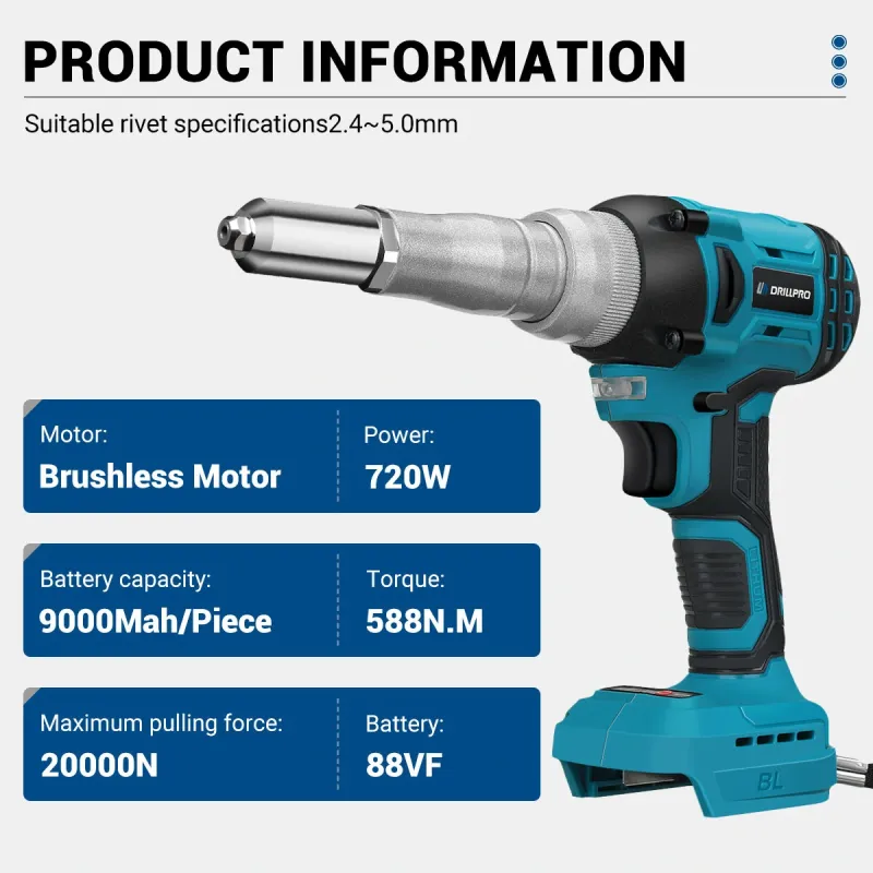 Drillpro 720W Brushless Electric Rivet Gun High Power Cordless Tool with 2000RPM Speed 588N.M Torque Suitable for 2.4~5.0mm Rivets Compatible with Mak 18V Battery Powerful Efficient Versatile