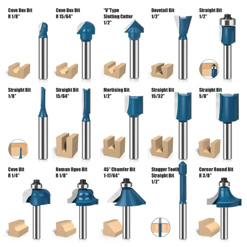 15PCS 1/4 Inch 6.35mm Shank Tungsten Carbide Wood Router Bits Set Chamfer Router Bit Milling Cutter for for Trimming / CNC Machine Engraving