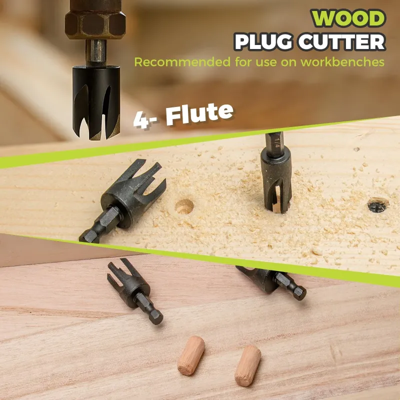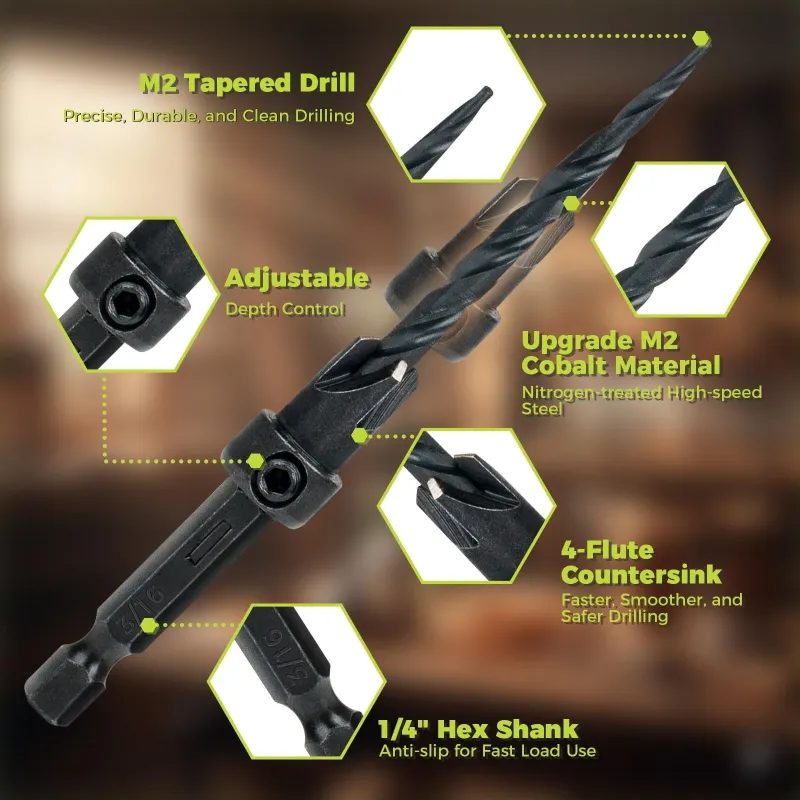 15PCS High Speed Steel HSS Countersink Drill Bit Set Adjustable Depth Tapered Drill Bits for Wood Black Oxide Spiral Flute Woodworking Tool with Plug Cutters and Hex Shank