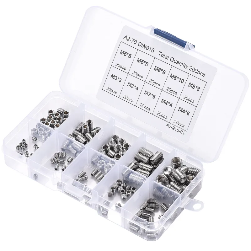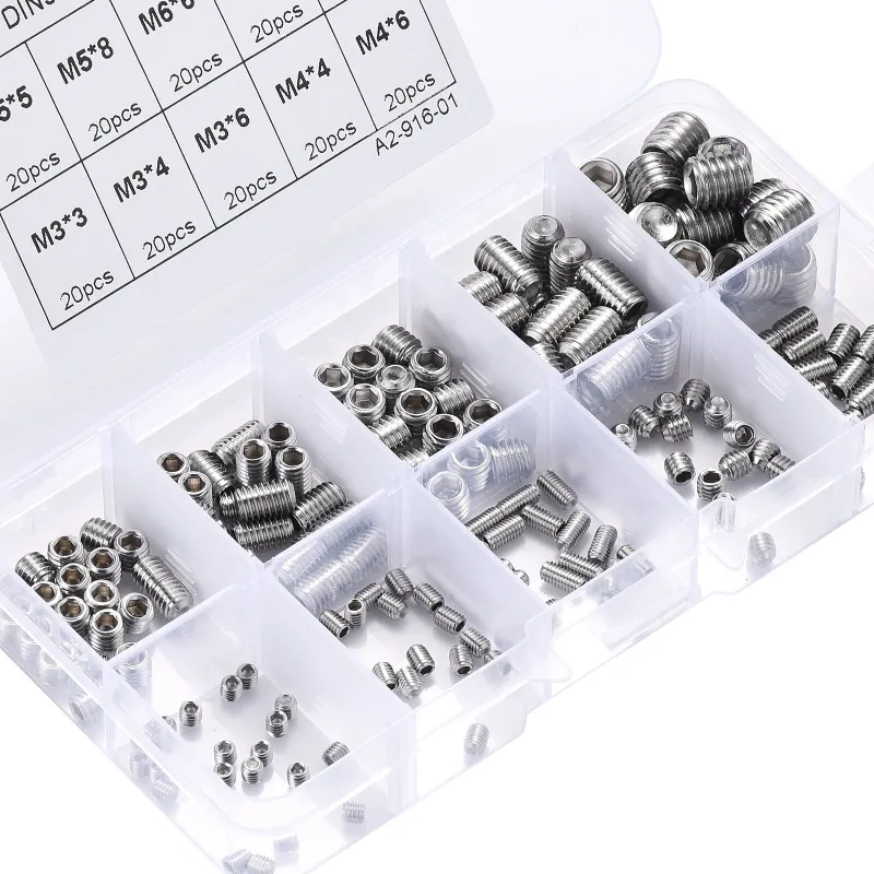 200pcs 304 Stainless Steel Set Screw M3 M4 M5 M6 M8 Allen Head Socket Hex Grub Screw Set Cup Point Assortment Kit Metric