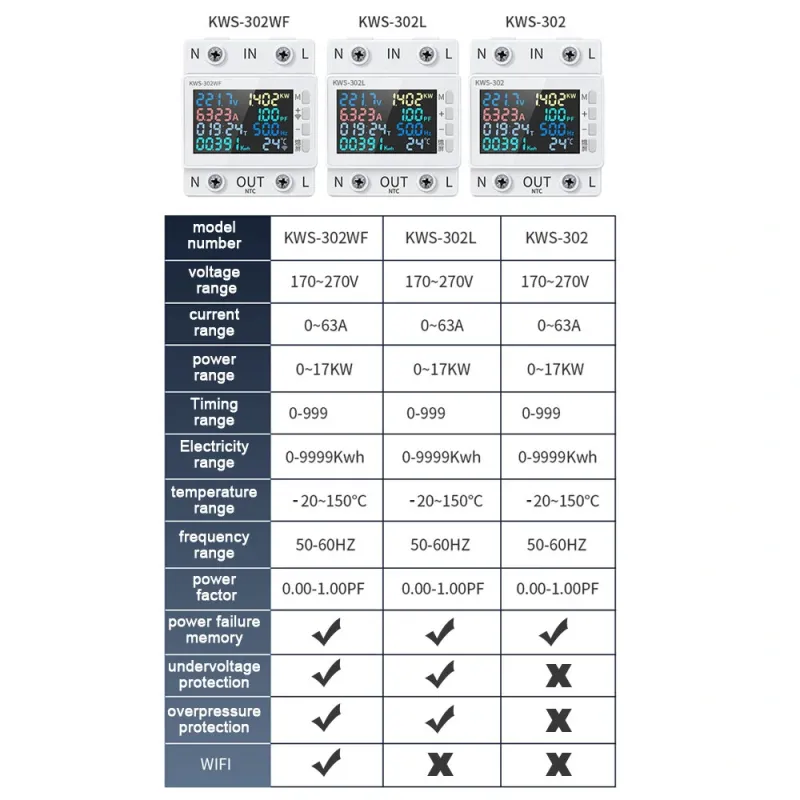 8in1 Power Meter Color Screen 2P Multi-function AC Energy Meter 170-270V/63A Voltage and Current Meter Standard Rail Mounting