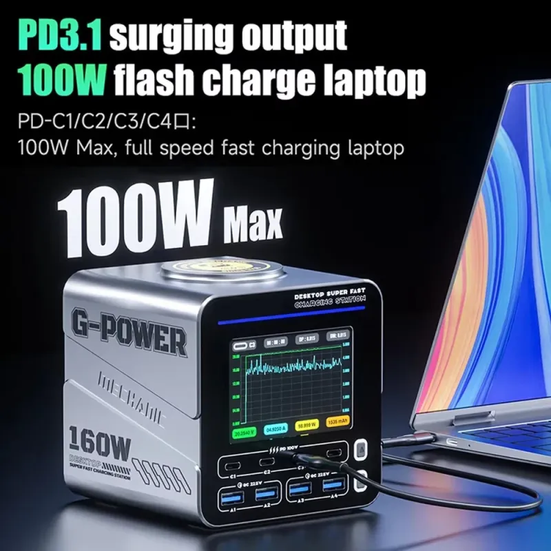 G-POWER 160W Nitride Charger GaN Fast Charger 8-Port PD3.1 QC USB-C USB-A Charging Station with 15W Wireless Charge Metal Body