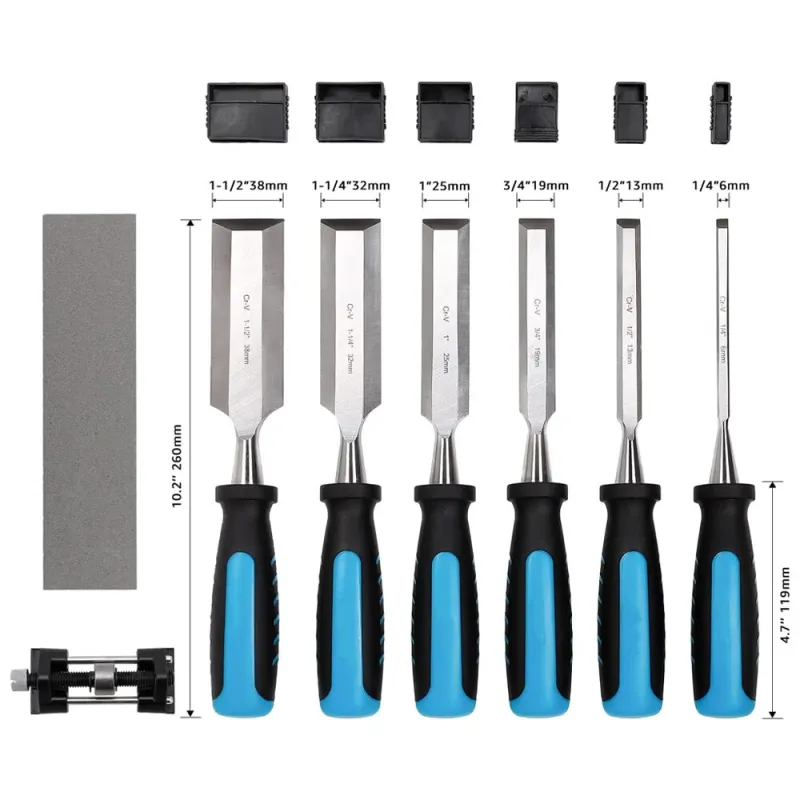 8-Piece Wood Carving Chisel Set Chromium-Vanadium Steel Blades Wood Handles Sharpening Stone and Honing Guide for Woodworking